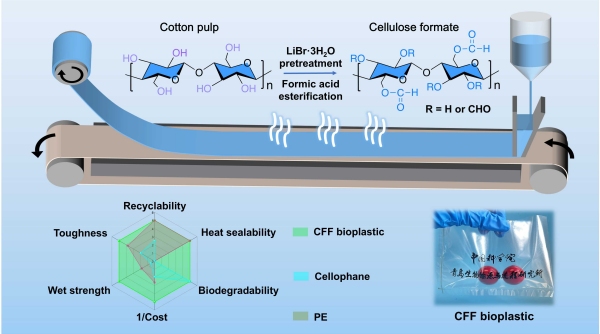 传统的石油基塑料薄膜因不可生物降解且回收率低,已对生态环境和人类健康构成严重威胁。因此,人们越来越关注开发绿色生物基塑料薄膜。纤维素具有良好的生物可降解性和特殊的线性柔性结构,成为制备生物塑料薄膜的理想材料。然而,纤维素基生物塑料由于耐水性差、缺乏热封性,其实际应用受限。 中国科学院青岛生物能源与过程研究所科研人员,在前期对木质纤维素熔盐水合物预处理及相关功能材料开发的基础上,通过绿色、温和的熔盐水合物预处理及酯化反应,开发了兼具高取代度和高聚合度的纤维素甲酸酯。通过流延法获得的纤维素甲酸酯生物塑料薄膜(CFF)展现出良好的耐水性和热封性。 与传统的纤维素基玻璃纸原纸和石油基聚乙烯(PE)薄膜相比,CFF具有更高的拉伸强度和韧性,其湿强度为72.9 MPa,优于大多数已报道的纤维素基生物塑料膜。由于预处理和酯化取代导致的去结晶化,这种CFF还表现出独特的热封性,其热封强度为61 MPa,显著高于所有已报道的纤维素生物塑料。此外,CFF具有出色的包装性能,包括对水蒸气、空气和油的高阻隔性,高透明度,良好的印刷适性和抗菌性能,满足高质量纤维素基包装薄膜的应用需求。 更重要的是,与玻璃纸原纸和PE膜相比,这种生物塑料在自然填埋或堆肥条件下具有良好的生物降解性和可循环回用性,对环境影响较低。其制备过程绿色,具有规模化生产的潜力,未来有望替代石油基绿色薄膜,广泛应用于高品质绿色包装和功能性先进应用领域,如作为柔性基膜用于太阳能电池和电子器件等。 相关研究成果以A Green Carbon-Based Cellulose Formate Film Bioplastic with High Wet Strength, Excellent Heat Sealability, and Recyclability Fabricated Under Ambient Conditions为题,发表在Small上。研究工作得到国家自然科学基金等的支持。 论文链接【https://doi.org/10.1002/smll.202501587】