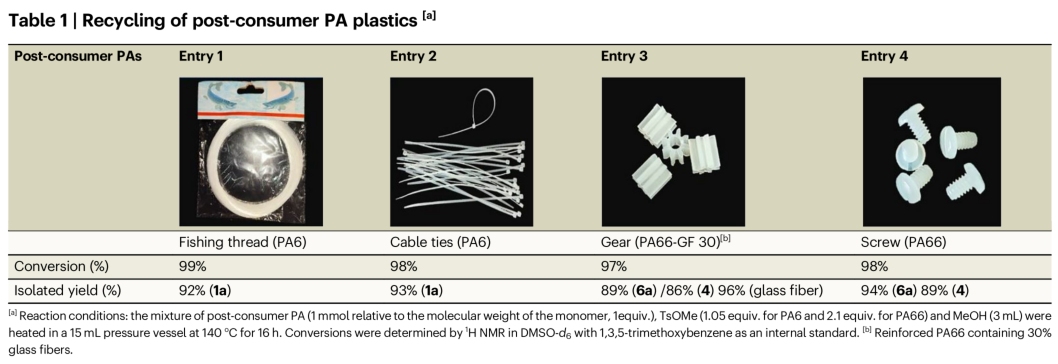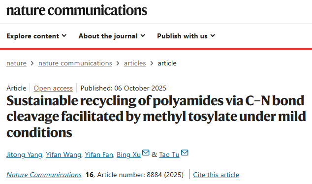 全球塑料消费量的不断攀升导致了严重的环境问题,尤其是“白色污染”的加剧。由于废弃塑料处置不当和回收不足,近91%的塑料被焚烧或填埋,不仅增加了温室气体排放,还导致微塑料向环境泄漏。为实现环境友好型经济,塑料回收已成为关注焦点,其中化学回收因其能将聚合物分解为单体并实现闭环循环而备受重视。聚酰胺(俗称尼龙)作为五大工程塑料之一,年市场规模超过850万吨,但其酰胺键因共振稳定和强氢键作用而化学性质稳定,难以在温和条件下降解,传统方法需在高温高压下进行,限制了其可持续回收。 近日,复旦大学涂涛教授、Xu Bing合作提出了一种创新方法:利用甲苯磺酸甲酯作为活化剂,在温和条件下通过醇解实现聚酰胺的高效解聚。该策略能将多种聚酰胺转化为高价值单体,如ε-己内酰胺、氨基酸酯或二胺/二酯,且产率接近定量,选择性优异。实验与理论机理研究表明,对甲苯磺酸在醇解过程中扮演关键角色,通过醇对酰胺基团的亲核攻击介导四面体中间体的形成,为聚酰胺的闭环回收提供了可行路径。相关论文以“Sustainable recycling of polyamides via C–N bond cleavage facilitated by methyl tosylate under mild conditions”为题,发表在Nature Communications上,论文第一作者为Yang Jitong。