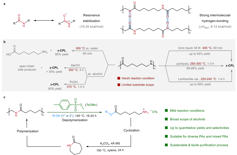 图1 | 聚酰胺化学回收的挑战与策略。 a 尼龙中酰胺键断裂的挑战。 b 以往将PA6解聚为ε-己内酰胺的策略。 c 甲苯磺酸甲酯在温和反应条件下实现聚酰胺闭环回收。