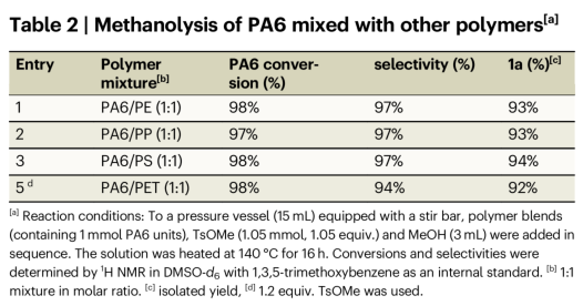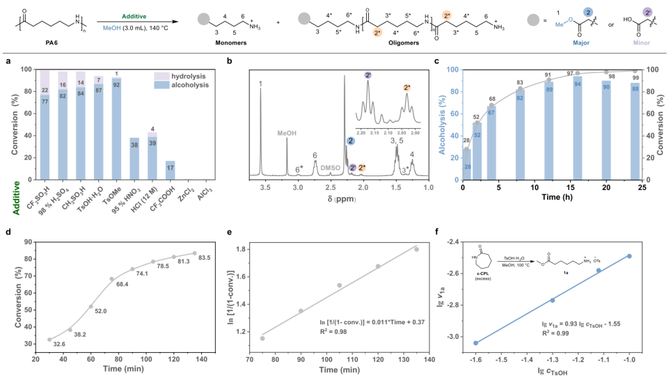 在研究初期,团队以PA6为模型,系统筛选了醇解添加剂。结果表明,甲苯磺酸甲酯在甲醇中能快速转化为对甲苯磺酸,高效促进PA6降解,且醇解选择性优于其他布朗斯特酸或路易斯酸。通过核磁共振监测反应过程,研究人员观察到酰胺键相关信号逐渐减弱,而酯基和质子化氨基信号增强,证实了醇解的高效性。动力学分析显示,反应符合一级动力学特征,且对甲苯磺酸浓度与反应速率呈正相关。