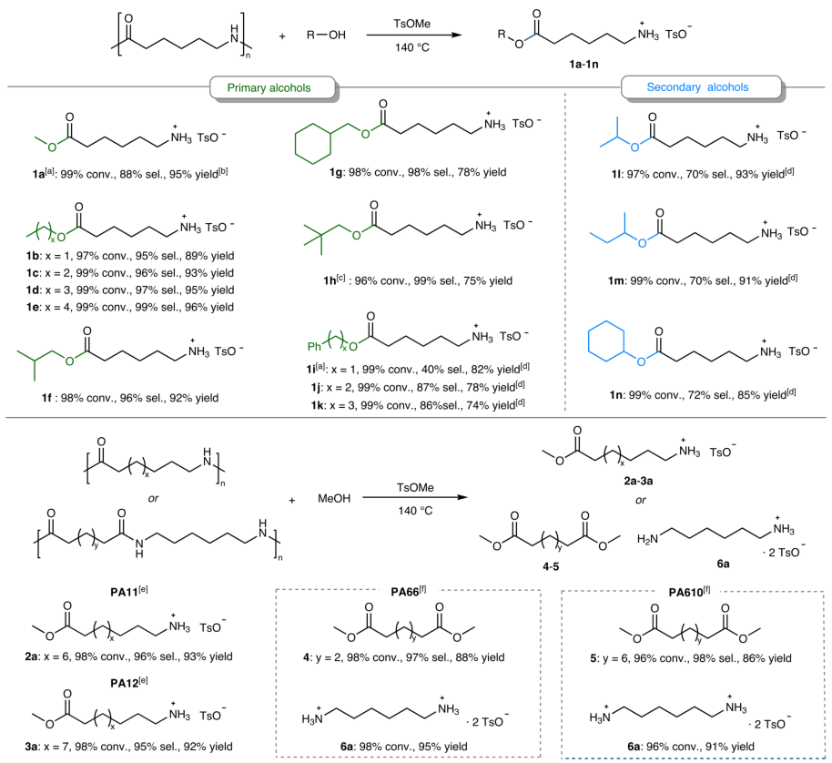 图2 | PA6醇解的添加剂筛选与动力学研究。 a PA6甲醇解的添加剂筛选。 b 使用甲苯磺酸甲酯时反应混合物的核磁共振氢谱。 c 在140℃下使用1.05当量甲苯磺酸甲酯时PA6转化率与甲醇解程度随时间的变化曲线。 d 在过量对甲苯磺酸存在下PA6的降解曲线。 e PA6单元拟一级动力学拟合曲线。 f 以ε-己内酰胺为模型底物对甲苯磺酸进行初始速率动力学研究。 进一步探索底物范围时,研究团队发现该策略对多种醇和聚酰胺均表现出良好适用性。脂肪族伯醇能与PA6高效反应,获得高转化率与选择性;芳香醇虽适用,但选择性略低。而对于PA66、PA11和PA12等其它聚酰胺,该方法同样能将其解聚为二胺甲苯磺酸盐和二酯,产物可通过溶剂萃取与重结晶分离纯化。值得注意的是,即使对于含有玻璃纤维增强材料的工业尼龙制品,该方法也能在降解聚酰胺的同时完整回收增强材料,展现出优异的实际应用潜力。