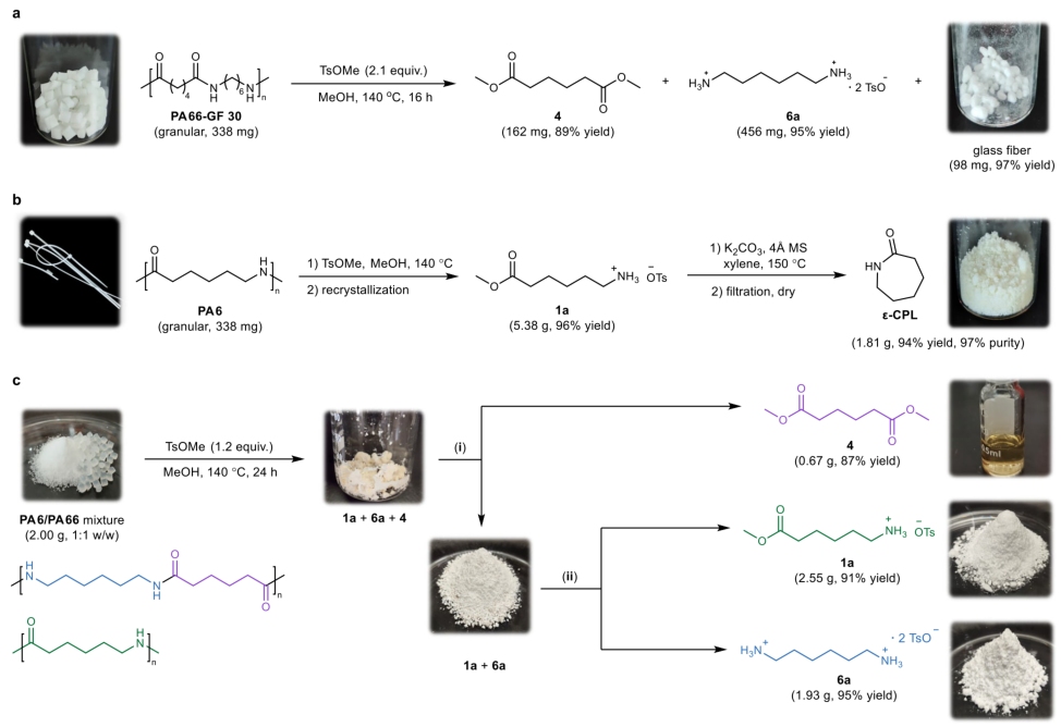 图3 | 醇和聚酰胺在醇解反应中的底物范围。 反应条件:聚酰胺(1 mmol,以单体分子量计)、甲苯磺酸甲酯(1.5当量)和醇(3.0 mL)在140℃加热24小时。 为实现闭环回收,团队还对降解产物进行了后续处理。氨基酸甲酯可通过中和反应转化为对应氨基酸酯,作为合成PA11和PA12的单体;而ε-己内酰胺的回收则通过氨基酯的分子内环化实现,在碱性条件下以高收率获得高纯度产物。此外,甲苯磺酸甲酯在使用后可以甲苯磺酸钾形式回收,并再生为活化剂,体现了该过程的可持续性。