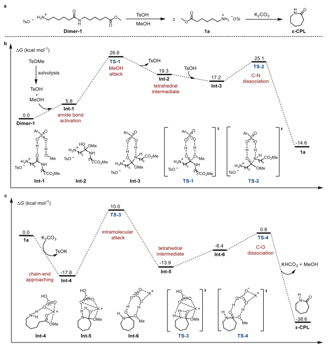 理论计算进一步揭示了反应机理:对甲苯磺酸通过协同质子转移激活酰胺键并中和氨基,推动醇解过程;而环化反应则经历氨基对酯基的分子内亲核攻击,形成四面体中间体,最终闭环生成ε-己内酰胺。这些发现为理解聚酰胺在温和条件下的降解路径提供了重要依据。