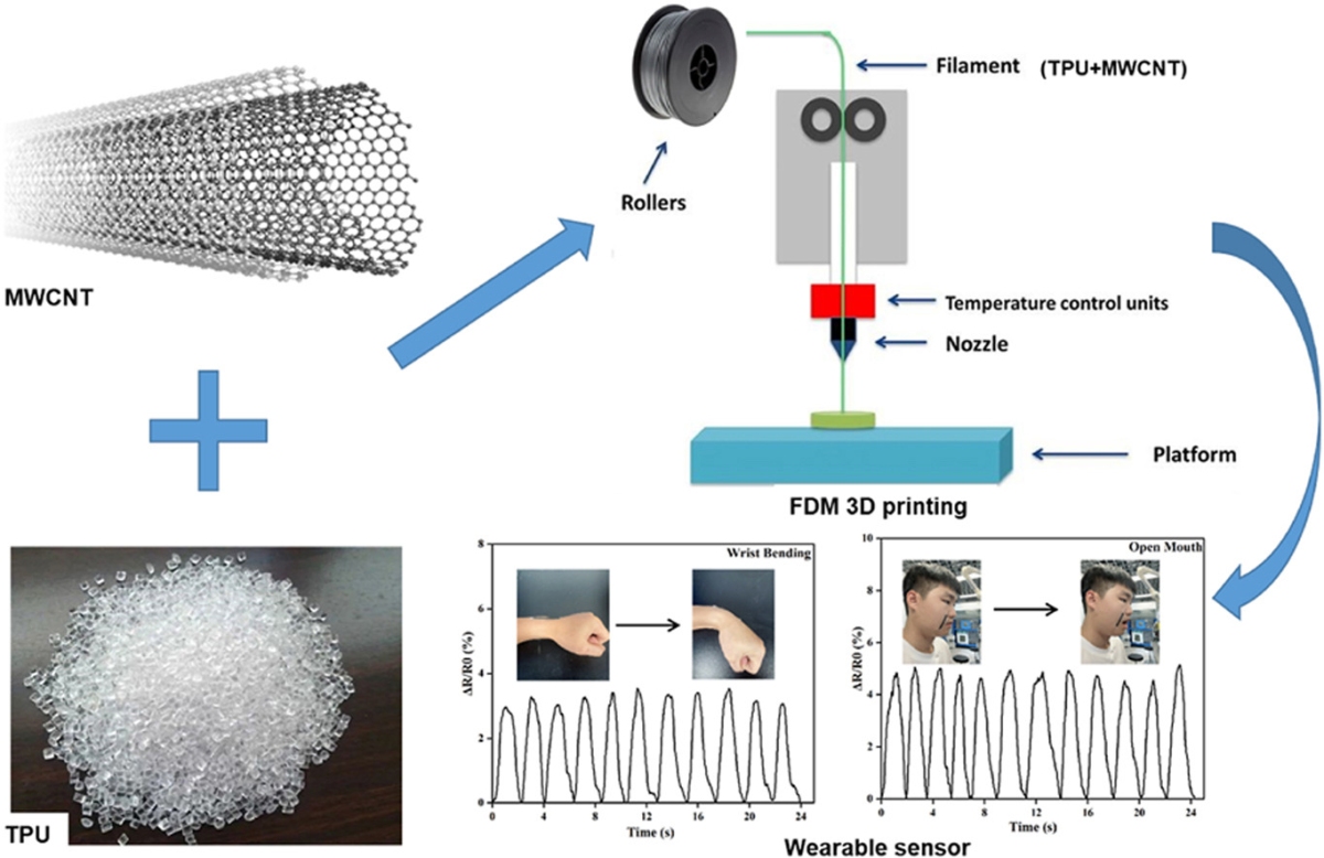 随着信息时代的发展,人们对传感器的探测范围、灵敏度、稳定性和功能丰富度提出了更高的要求。对于特定条件下的应力、温度和气体等监测需求,传统传感器已无法满足实际需要,柔性可穿戴传感器近来年受到广泛关注。然而,制造高灵敏度和宽检测范围的柔性应变传感器仍受到来自材料技术和制造手段的巨大挑战。传统的制造方法如模具成型、热压、静电纺丝等,在功能柔性设备的生产中面临各种困难和限制,难以满足复杂结构柔性传感器的需求。 针对上述问题,吴鑫副教授课题组在前期的研究工作基础上,利用溶液混合浇注法和双螺杆挤出技术,制备了高性能热塑性聚氨酯/多壁碳纳米管(TPU/MWCNT)纳米复合材料3D打印用丝材,并结合FDM 3D打印技术实现简易、快速地制造高性能柔性应变传感器(图1)。同时,提出了通过添加 PCA(1-芘甲酸) 改善 MWCNT 在 TPU 复合材料中的分散性,进而提高复合材料的热稳定性以及在不同拉伸应变下机械和电学性能的方法。研究发现,制备的TPU/MWCNT(3wt%)/PCA纳米复合材料具有优异的机电性能以及3D打印的TPU/MWCNT(3wt%)/PCA 柔性应变传感器在宽应变范围内表现出惊人的灵敏度(GF max=10279.95)。同时,3D 打印的柔性传感器显示出卓越的耐用性和可重复性。