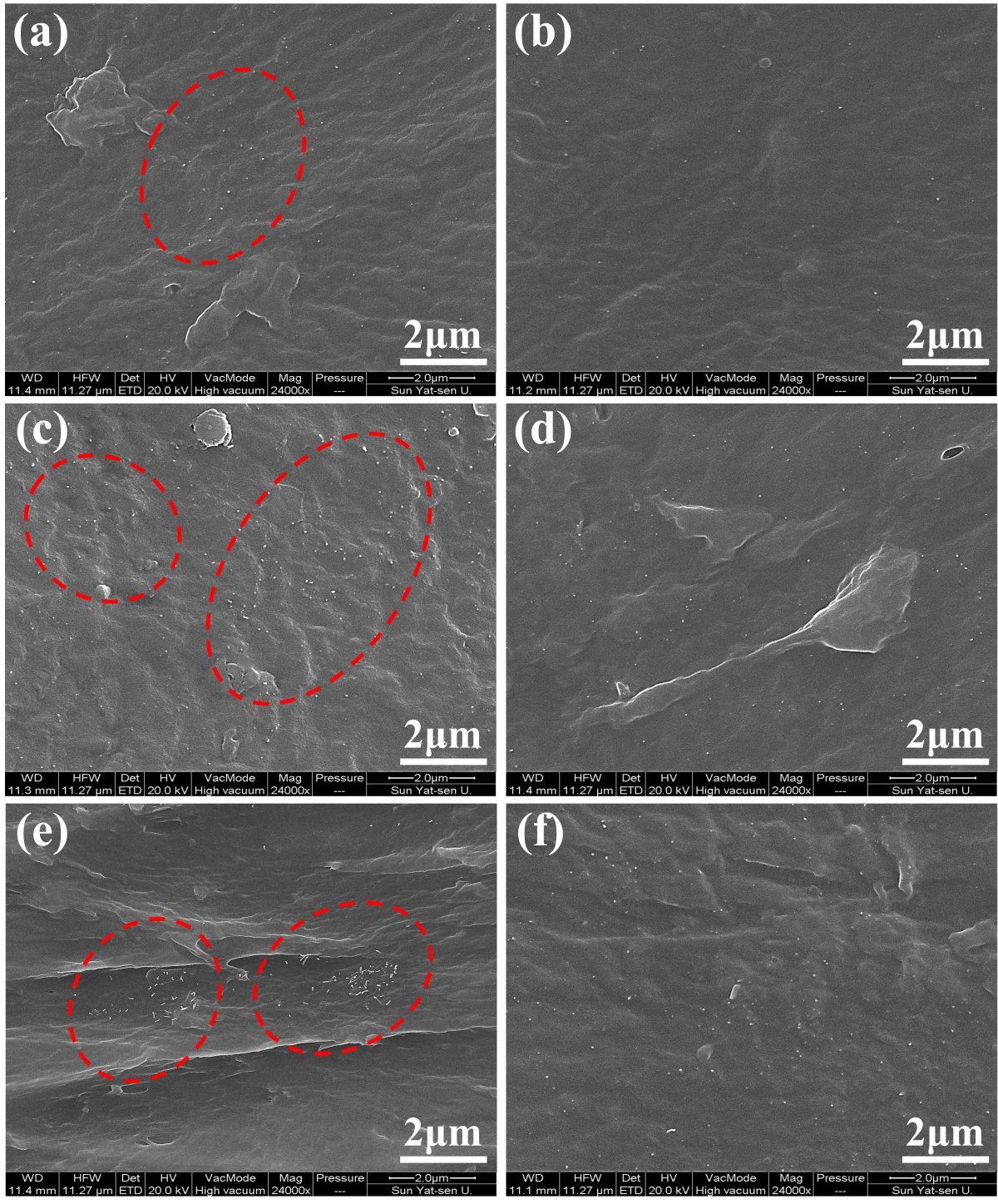 图1. 文章图片摘要 碳纳米管在TPU 纳米复合材料中的分散性是影响传感器性能和机械性能的关键因素。为此,课题组提出一种通过添加PCA提高复合材料分散性的方法。通过高分辨FESEM 观察不同 MWCNT 填充浓度下的 TPU 纳米复合材料 3D 打印样品的表面形态(图2)。从图 2(a、c、e)中可以看出,在不添加PCA的情况下,随着 MWCNT 填充浓度的增加,TPU 复合材料中的 MWCNT 团聚现象加剧(代表 MWCNT 的小白点),尤其是在 MWCNT 含量为 4wt% 时,TPU 纳米复合材料中的 MWCNT 团聚现象更为明显(图 2(e))。添加PCA后(图 2(b、d、f)),可以清楚地观察到MWCNT在复合材料中均匀分布,而不是聚集在一起,这表明添加PCA后,TPU/MWCNT/PCA复合材料具有更好的 MWCNT 分散性。这些观察结果表明,添加 PCA 可有效改善 MWCNT 在基于TPU的纳米复合材料中的分散性。