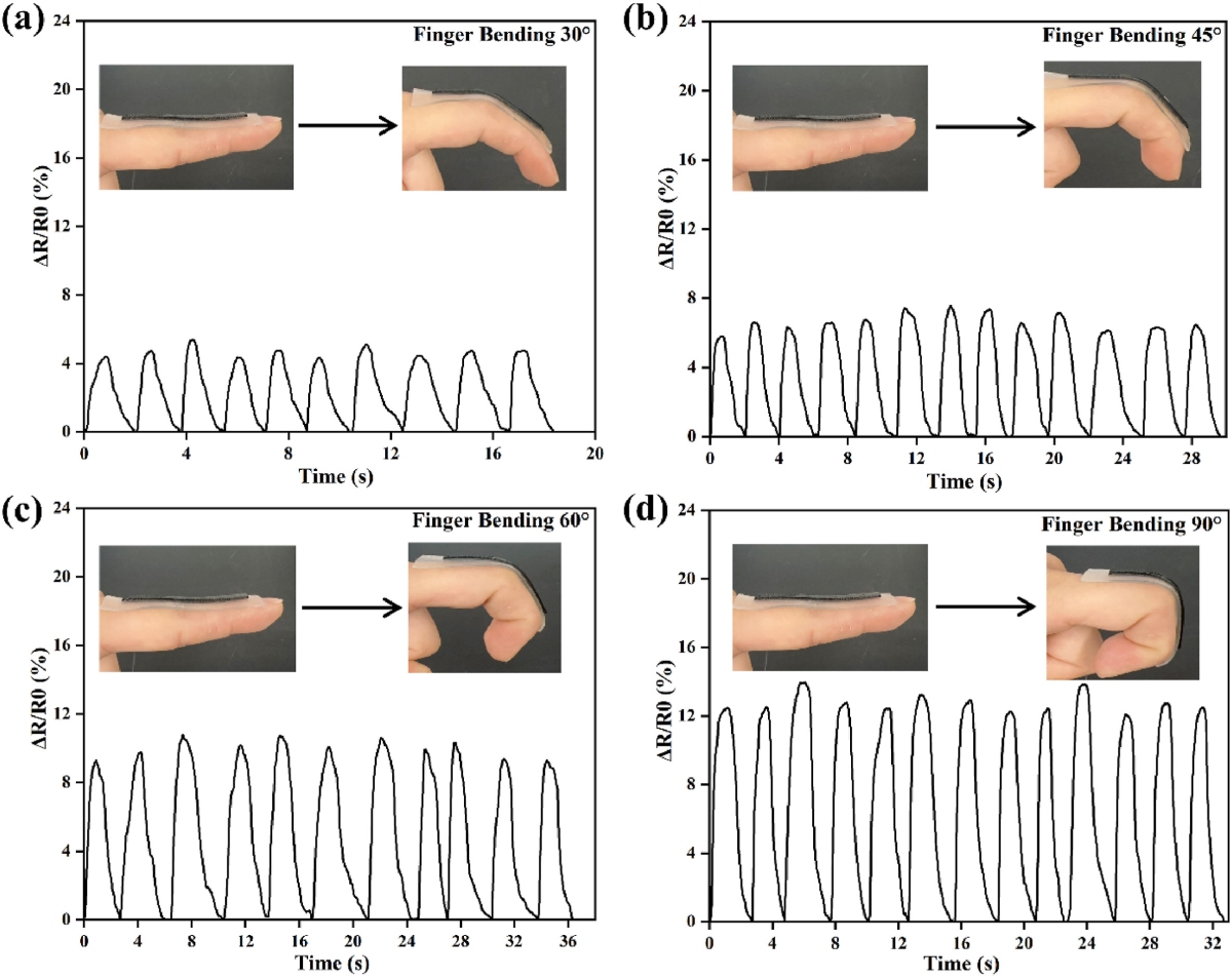 图3. 3D 打印TPU/MWCNT(3wt%)/PCA 柔性应变传感器在手指弯曲不同角度下的相对电阻变化:(a) 弯曲30°,(b) 弯曲 45°,(c) 弯曲 60°,(d) 弯曲 90°。