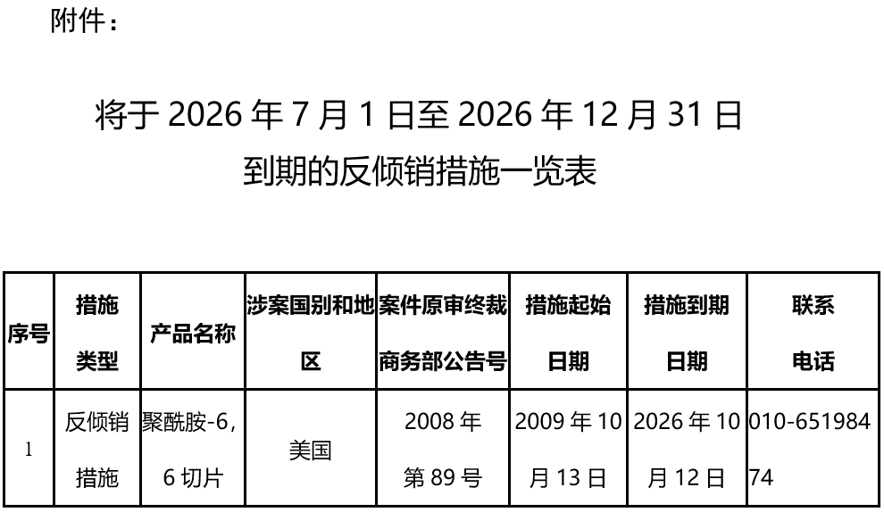 2025年12月29日,商务部网站发布《关于2026年下半年部分反倾销措施即将到期的通知》。 通知称,根据《中华人民共和国反倾销条例》第四十八条规定,反倾销税的征收期限和价格承诺的履行期限不超过5年;但是,经复审确定终止征收反倾销税有可能导致倾销和损害的继续或者再度发生的,反倾销税的征收期限可以适当延长。 为使利害关系方及时了解措施实施期限,商务部贸易救济调查局对2026年7月1日至2026年12月31日到期的反倾销措施通知如下: 一、将于2026年7月1日至2026年12月31日到期的反倾销措施通过本通知一并对外告知(见附件),商务部贸易救济调查局不再发布个案措施到期通知。 二、在本通知附件所列个案反倾销措施到期日60天前,相关国内产业或代表国内产业的自然人、法人或有关组织如认为,终止该措施有可能导致倾销和损害的继续或者再度发生的,可以书面形式向商务部提出期终复审申请。 三、期终复审申请书应包含:要求进行期终复审的明确表示,终止该反倾销措施将可能导致倾销和损害的继续或者再度发生的证据材料。 四、如相关国内产业或代表国内产业的自然人、法人或有关组织未按本通知的规定提出期终复审申请,同时在相关反倾销措施到期前,商务部也未主动发起期终复审调查,则该反倾销措施将自措施到期之日起终止实施。  |
