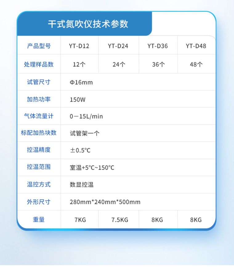 12位 圆形水浴氮气吹干仪 氮气吹扫装置360度旋转自由升降 产品说明: 圆形水浴氮吹仪利用吹扫捕集技术,同时可对样品进行控温加热,通过氮气等惰性气体快速、可控、连续地吹到样品表面来达到样品溶液快速无氧浓缩。该方法具有省时、便捷、准确的特点。广泛用于食品安全、医药、农药残留检测、临床药代等领域。 主要特征: 圆形水浴氮吹仪适用于试管、锥形瓶、离心管等不同规格的容器。 样品位数:12位/24位,弹簧试管夹的样品架固定定位,每个样品都有数字编号。 试管通过带弹簧的试管夹和支撑盘来固定位置,可任意调节高度方向。 自由升降的针型阀管,根据试管大小和溶剂多少,各导气管可独立升降至合适的高度,同时可调的针型阀能管控制气体流量。 圆形结构,转动自如,方便样品支架进出水浴,操作方便。 智能数字温控器,可定时,双数字显示,调节采用PID技术并可实现超温报警及防干烧。 圆形氮吹仪的所有部件均匀不锈钢制造,可耐酸碱等有机溶剂。 调节阀:保证良好的气密性,经久耐用。 在浓缩有毒溶剂时,整个系统可置于通风柜中。 技术参数: