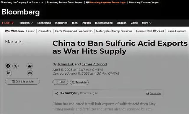 受中东地缘冲突升级与中国出口政策调整双重因素影响,全球硫酸及上游原料硫磺市场正经历剧烈震荡,价格大幅飙升,供应链持续趋紧。 作为磷肥生产、有色金属冶炼、钛白粉、化纤等领域的核心基础原料,硫酸供应危机已从化工圈蔓延至全球粮食安全与金属产业链,引发广泛担忧。 一、中东航运受阻全球硫磺供应链“大动脉”告急 中东地区是全球硫磺供给核心枢纽,供应全球约三分之一硫磺,全球约50%海运硫磺贸易经海湾地区发出。而硫磺是硫磺酸最主要原料,中国硫酸生产对进口硫磺依存度长期在50%以上,其中过半来自中东。 2026年2月底以来,伊朗相关冲突持续升级,霍尔木兹海峡航运受阻,全球硫磺贸易关键通道近乎“断流”。叠加卡塔尔等中东大型硫磺加工设施因袭击出现生产中断、俄罗斯将硫磺出口禁令延长至2026年6月,全球硫磺供给骤然收紧。 价格方面,冲突爆发以来国内硫磺价格暴涨超65%。截至4月8日,国产固体硫磺均价达6376.5元/吨,较2月28日上涨2524.62元,涨幅65.54%;液体硫磺均价6426.08元/吨,涨幅68.08%。国际市场同步大幅上行,原料成本飙升直接传导至下游硫酸市场。 二、我国5月起限制硫酸出口全球最大供应方收紧阀门 据彭博社及国内多方消息,我国于2026年4月10日正式宣布,自5月1日起全面限制冶炼副产硫酸出口,仅电子级硫酸等极少数特殊品类获出口豁免。