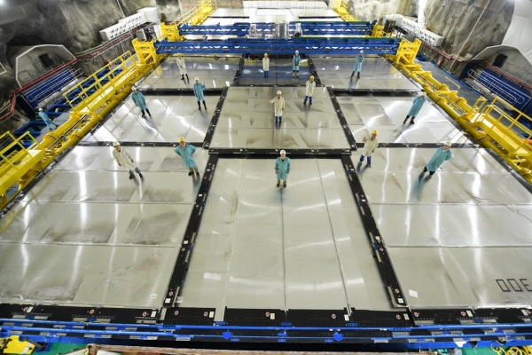 8月26日,江门中微子实验(JUNO)成功完成2万吨液体闪烁体灌注,正式运行取数。经过十余年的准备和建设,JUNO成为国际上首个运行的超大规模和超高精度中微子专用大科学装置。JUNO在试运行期间首批获取的数据显示,其探测器关键性能指标全面达到或超越设计预期,这使JUNO能够着手解决粒子物理学领域未来十年内的一个重大问题:中微子质量排序——即第三种中微子(ν₃)是否比第二种(ν₂)更重。 JUNO探测器位于广东省江门市附近的地下700米处,可以探测53公里外台山和阳江核电站产生的中微子,并以前所未有的精度测量它们的能谱。与国际同类实验相比,JUNO对质量顺序的测定不受地球物质效应和其他未知中微子振荡参数的影响,并将显著提高6个中微子振荡参数中的三个参数的精度。JUNO实验能够对来自太阳、超新星、大气和地球的中微子开展前沿研究,并将开启探索未知物理的新窗口,包括对不活跃中微子和质子衰变的搜寻。 JUNO由中国科学院高能物理研究所于2008年提出构想,2013年得到中国科学院战略性先导科技专项(A类)支持,并在同年得到广东省人民政府的支持,2015年启动隧道和地下实验室建设。2021年12月完成实验室建设并开始探测器在地下实验室的安装建设,2024年12月探测器主体建设完成并开始灌注超纯水与液体闪烁体。 在灌装过程中,项目团队首先在45天内完成超过6万吨超纯水的灌注,将内外有机玻璃球的液位差控制到厘米量级,流量偏差不超过0.5%,保障了探测器主体结构的安全稳定。随后经过半年的精细操作,将2万吨液体闪烁体精准注入直径35.4米的有机玻璃球内,并同步完成原有纯水的置换。超纯水与液体闪烁体的超高洁净度、透明度和极低放射性本底等特殊要求全部得到满足。同时,项目团队完成了探测器的调试优化,确保了探测器在灌注完成后立刻进入正式运行取数阶段。 JUNO的核心探测器为有效质量达2万吨的液体闪烁体探测器(中心探测器),安置于地下实验大厅44米深的水池中央。直径41.1米的不锈钢网壳作为主支撑结构,承载了包括35.4米直径的有机玻璃球、两万吨液体闪烁体、两万只20英寸光电倍增管、两万五千只3英寸光电倍增管以及前端电子学、电缆、防磁线圈和隔光板等众多关键部件。遍布探测器内壁的光电倍增管协同工作,探测中微子与液闪相互作用产生的闪烁光,并将其转换为电信号输出。 作为中国科学院高能物理研究所主导的重大国际合作项目,JUNO的成员涵盖来自17个国家和地区、74个科研机构的700名研究人员。 JUNO的设计使用寿命可达30年,后期可升级改造为世界最灵敏的无中微子双贝塔衰变实验。这样的升级将探测中微子绝对质量,检验中微子是否为马约拉纳粒子,从而解决粒子物理、天体物理和宇宙学的前沿交叉热点难题,并深刻影响我们对宇宙的理解。