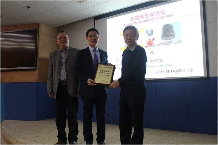 我校石墨烯研究院特聘研究员、浙江大学高分子研究所所长高超教授受邀为参会企业和我校师生做了《石墨烯宏观组装》主题讲座。叶世满副校长、田中群院士为高超教授颁发了卢嘉锡讲座纪念牌。高超团队在石墨烯纤维、石墨烯气凝胶等宏观组装材料上取得了具有国际影响的原创性工作,特别是基本掌握了国际领先的原位聚合制备石墨烯复合纤维技术。今年,我校石墨烯研究院将该技术作为重大项目引入我省,通过与厦门翔鹭化纤、福建恒申集团的密切产学研合作,已于不久前取得了中试成功,有望规模化生产集紫外防护、抗静电、远红外发射、抗菌等众多优异性能于一身的复合纤维,开创新一代“全能王”纤维品种。借助本次研讨会,两家龙头企业与我校就石墨烯复合纤维在技术和市场等方面的推进展开交流与讨论,对进一步深化产学研合作进行了部署。
