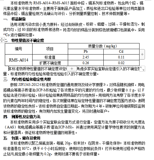 面粉中铅,镉成分分析标准物质