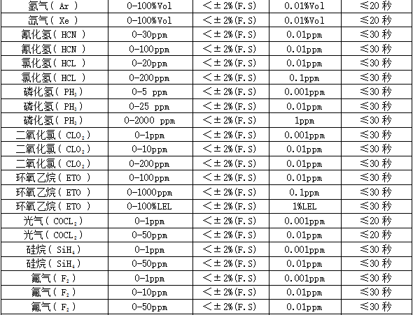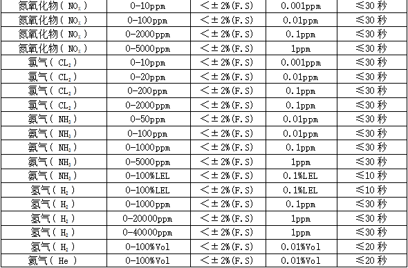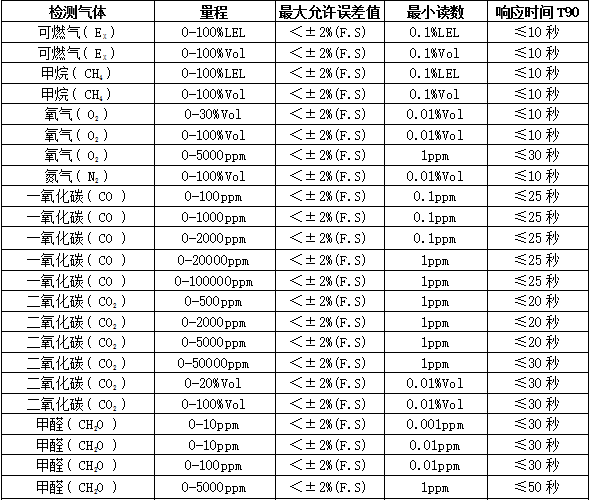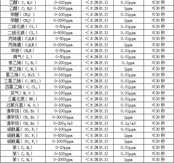 PTM600检测仪技术参数: 检测气体:C2H3CL 应用场合:石油、化工、医药、环保、燃气配送、仓储、烟气分析、空气治理等所有需要便携式快速检测气体浓度的场合。 检测范围:0-3.6%Vol 分 辨 率:0.01ppm或0.001ppm(0~10 ppm);0.01ppm(0~100 ppm),0.1ppm(0~1000 ppm),1ppm(0~1000 ppm以上),0.01毫克/升(0~200%毫克/升),0.1%LEL,0.01%,0.001%Vol 检测原理:红外,高精度,长光程高分辨率,配合过滤器使用 允许误差:≤±2%F.S (其他或更高精度可订制) 线 性 度:≤±2% 响应时间:T90≤20秒重 复 性:≤±2%不确定度:≤±2% 工作环境:温度:-40℃~+70℃,湿度:≤10~95%RH,内置过滤器可在高湿度或高粉尘环境使用恢复时间:≤30秒 样气温度:-40℃~+70℃ ,选配高温采样降温过滤手柄,最高可检测1300度的烟气浓度 温湿度测量:选配:温度-40℃~+70℃,精度0.5℃;湿度0~100%RH,精度3%RH 工作电源:3.7VDC,5400mAh×2大容量可充电高分子聚合物电池 显示方式:3.5寸高清彩屏 检测方式:内置泵吸式测量,流量800毫升/分钟。标定流量要大于800毫升/分钟,要接三通管进行分流,保证有多余的气体从旁路排出 报警方式:声光报警、关闭报警可设 通讯接口:USB(充电与通讯),选配:RS232、红外通讯,自动识别 数据存储:大容量数据存储,支持扩容。 防护等级:IP66 防爆类型:本质安全型 防爆标志:Ex ia IIC T4 Ga 防爆证号:CNEx16.3091 执行标准:GB 15322.3-2019《测量范围为0-100%LEL的便携式可燃气体传感器》 GB 3836.1—2010 《爆炸性气体环境用电气设备 通用要求》 GB 3836.4—2010 《爆炸性气体环境用电气设备 本质安全型“i”》 外型尺寸:255×210×125mm(L×H×W), 定制:420×210×125mm(L×H×W) 重 量:2.5Kg 标准附件:说明书、合格证、保修卡、USB充电器(含数据线)、高档铝合金仪器箱 、内置湿度粉尘过滤器 、40cm不锈钢采样手柄(1米软管,带粉尘过滤器,不可伸缩) 选配项:温湿度测量功能、1.2 m 可伸缩采样手柄(1-10米软管,标准长度1米)、外置远距离采样泵、高温采样降温过滤手柄、高温高湿预处理系统、光盘(上位机通讯软件)、外置微型无线蓝牙打印机、内置微型打印机、SD卡存储、U盘存储、无线数据通讯 部分可检测气体列表:
