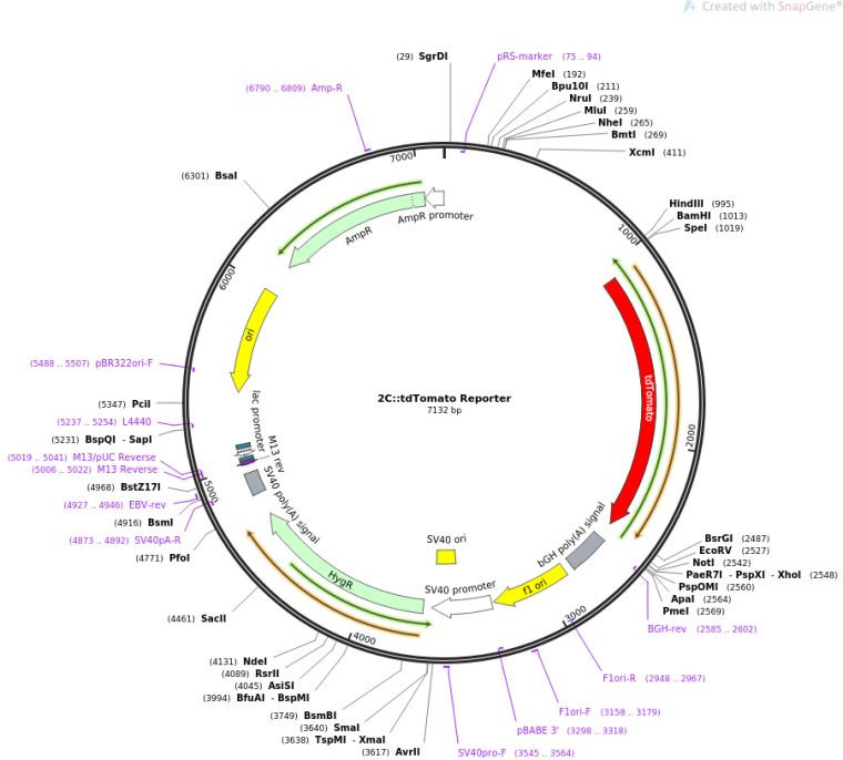 质粒名称:2C::tdTomato Reporter 质粒编号:40281 载体名称:pcDNA Hygro 载体大小:6400 载体类型:哺乳动物表达 筛选标记:潮霉素 原核抗性:氨苄青霉素,100μg/mL 培养温度:37℃ 克隆菌株:DH5alpha 高拷贝/低拷贝:高拷贝 插入基因:2C Promoter (2-cell stage promoter) 物种来源:M. musculus (mouse) 插入大小:730 克隆方法:限制性内切酶 5'克隆位点:Mlu1 (not destroyed) 3'克隆位点:HindIII (not destroyed) 5'测序引物:Amp-R 3'测序引物:BGH-rev 质粒图谱: