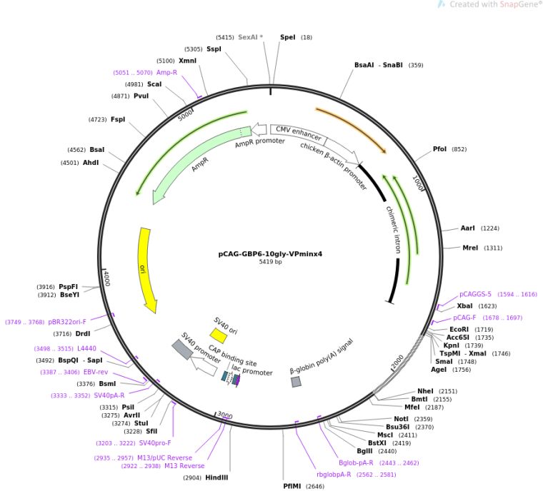 质粒名称:pCAG-GBP6-10gly-VPminx4 质粒编号:50796 质粒备注: Expression of a GFP-dependent transcription factor component in mammalian cells 载体名称:pCAG-GFP 载体大小:4823 完整质粒大小:5420 载体类型:哺乳动物表达 原核抗性:氨苄青霉素,100μg/mL 培养温度:37℃ 克隆菌株:DH5alpha 高拷贝/低拷贝:高拷贝 插入基因:GBP6-VPminx4 activation domain fusion protein 基因别名:ADG 基因别名:GBP6-10gly-VPminx4 物种来源:Synthetic 插入大小:597 启动子:CAG 克隆方法:限制性内切酶 5'克隆位点:AgeI (not destroyed) 3'克隆位点:NotI (not destroyed) 5'测序引物:GGACTTCCTTTGTCCCAAATCTG 3'测序引物:TAGCCAGAAGTCAGATGCTC 质粒图谱: