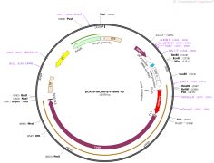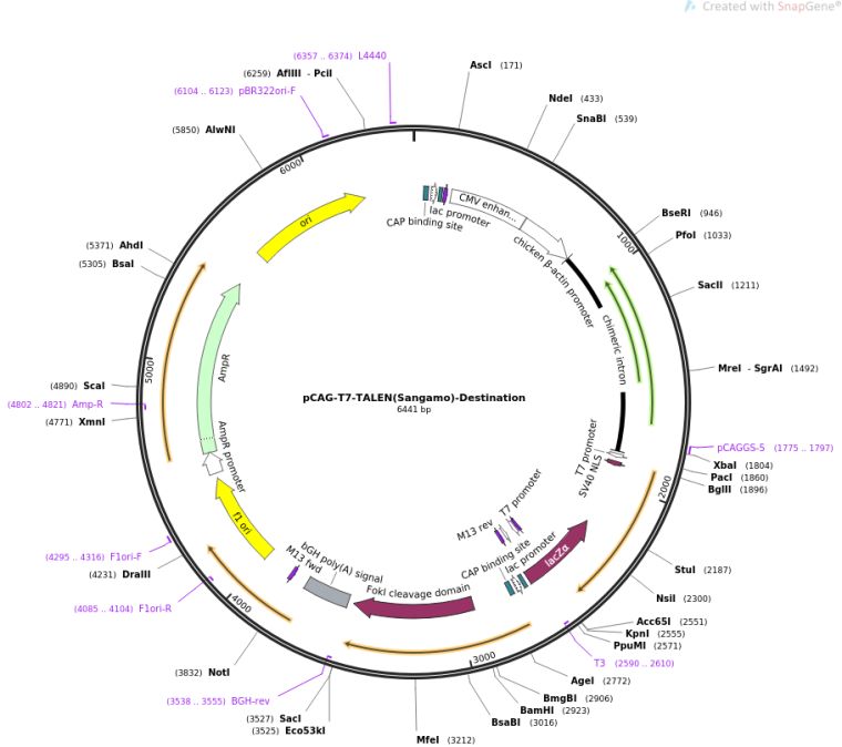 质粒名称:pCAG-T7-TALEN(Sangamo)-Destination 质粒编号:37184 质粒备注: (Empty Backbone) Destination vector for Voytas Golden Gate TALEN assembly incorporating a CAG promoter for mammalian expression and a T7 promoter for synthesis of TALEN mRNA. Uses homodimeric FokI domains. 载体名称:pDIRECT 载体大小:4810 载体类型:哺乳动物表达 原核抗性:氨苄青霉素,100μg/mL 培养温度:37℃ 克隆菌株:DH5alpha 高拷贝/低拷贝:高拷贝 启动子:CAG 克隆方法:限制性内切酶 5'测序引物:TAL_F1 (ttggcgtcggcaaacagtgg) 3'测序引物:TAL_R2 (ggcgacgaggtggtcgttg 质粒图谱:
