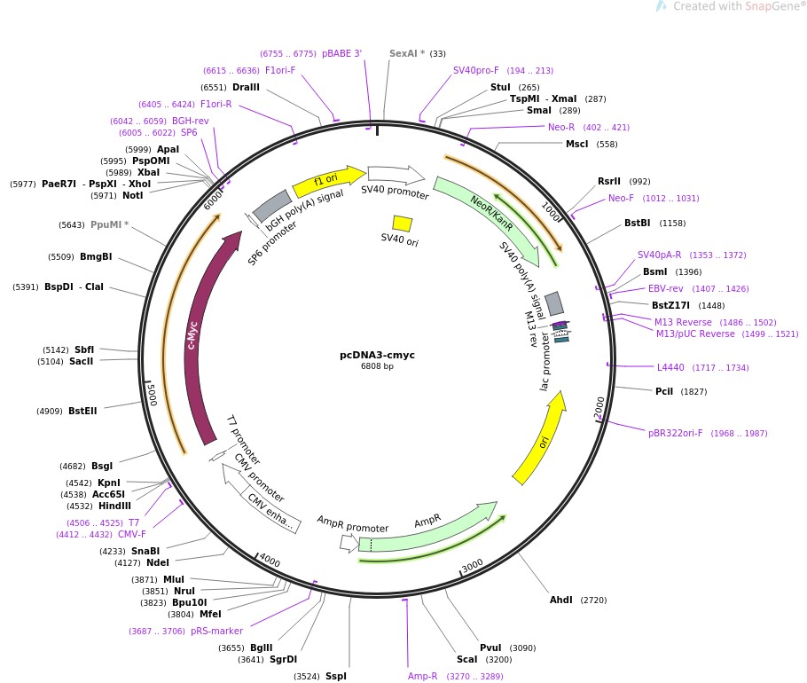 质粒名称:pcDNA3-cmyc 质粒编号:16011 质粒备注: mammalian expression of human cmyc 载体名称:pcDNA3 载体大小:5400 载体类型:哺乳动物表达 筛选标记:新霉素(G418) 原核抗性:氨苄青霉素,100μg/mL 培养温度:37℃ 克隆菌株:DH5alpha 高拷贝/低拷贝:高拷贝 插入基因:cmyc 物种来源:H. sapiens (human) 基因名称:MYC (a.k.a. MRTL, MYCC, bHLHe39, c-Myc) 克隆方法:限制性内切酶 5'测序引物:CMV-F 质粒图谱: