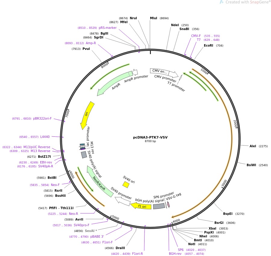质粒名称:pcDNA3-PTK7-VSV 质粒编号:65250 质粒备注: Expression of VSV tagged PTK7 in mammalian cells 载体名称:pcDNA3 载体大小:5446 完整质粒大小:8689 载体类型:哺乳动物表达 筛选标记:新霉素(G418) 原核抗性:氨苄青霉素,100μg/mL 培养温度:37℃ 克隆菌株:DH5alpha 高拷贝/低拷贝:高拷贝 插入基因:PTK7 基因别名:CCK4 物种来源:H. sapiens (human) 插入大小:3243 基因名称:PTK7 (a.k.a. CCK-4, CCK4) 启动子:CMV 克隆方法:限制性内切酶 5'克隆位点:EcoRI (not destroyed) 3'克隆位点:XbaI (not destroyed) 5'测序引物:CACTGCTTACTGGCTTATCG 3'测序引物:TGGCAACTAGAAGGCACAG 质粒图谱: