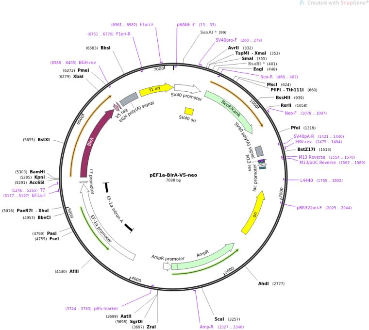 质粒名称:pEF1a-BirA-V5-neo 质粒编号:100548 质粒备注: Expresses C-terminal V5-tagged BirA biotin ligase 载体名称:pEF1a-V5-neo 载体大小:6174 完整质粒大小:7088 载体类型:哺乳动物表达 筛选标记:新霉素(G418) 原核抗性:氨苄青霉素,100μg/mL 培养温度:37℃ 克隆菌株:DH5alpha 高拷贝/低拷贝:未知 插入基因:C-terminal V5-tagged BirA 物种来源:E. coli 插入大小:963 启动子:Human EF1a 克隆方法:Gibson Cloning 5'测序引物:TAATACGACTCACTATAGGG 3'测序引物:TAGAAGGCACAGTCGAGG 质粒图谱: