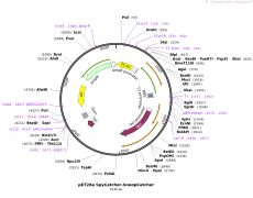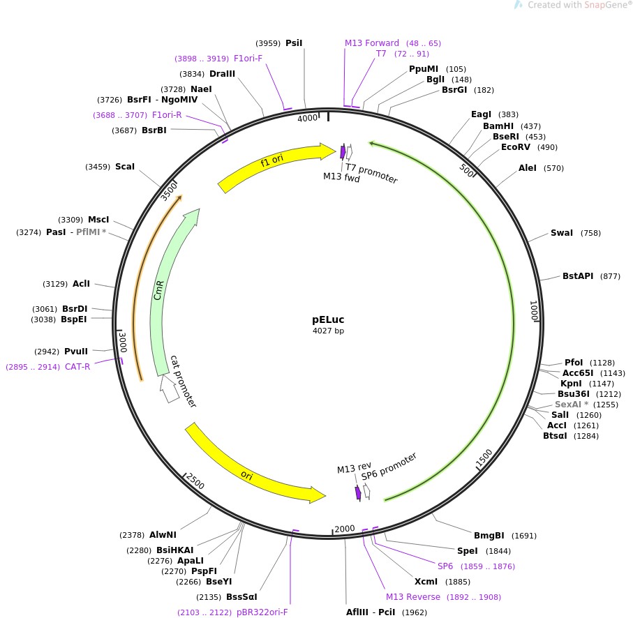 质粒名称:pELuc 质粒编号:118056 质粒备注: GBPart - ELuc Luciferase CDS 载体名称:pUPD3 载体大小:2343 完整质粒大小:4027 载体类型:Synthetic Biology ; Domestication of DNA parts for GoldenBraid asembly 原核抗性:氯霉素25μg/mL 培养温度:37℃ 克隆菌株:DH5alpha 高拷贝/低拷贝:高拷贝 插入基因:ELuc 基因别名:ELuc Luciferase CDS 物种来源:Synthetic 克隆方法:限制性内切酶 5'克隆位点:BsmBI (destroyed during cloning) 3'克隆位点:BsmBI (destroyed during cloning) 5'测序引物:gtaaaacgacggccagt 3'测序引物:gtcatagctgtttcctg 质粒图谱:
