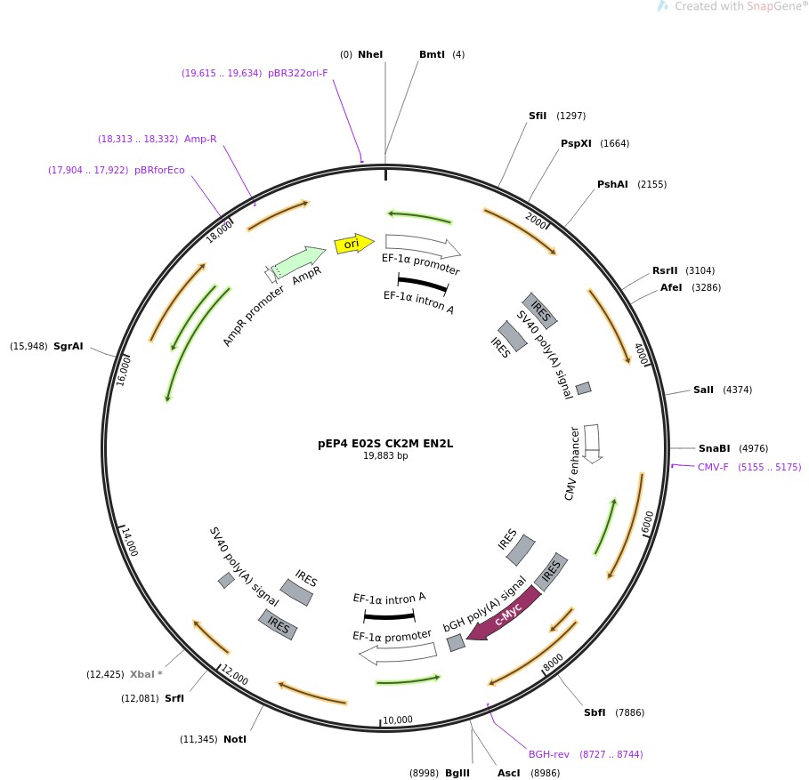 质粒名称:pEP4 E02S CK2M EN2L 质粒编号:20924 质粒备注: used in the derivation of human iPS cells using non-integrating episomal vectors; expresses Oct4 and Sox2; Klf4 and Myc; Nanog and Lin28 载体名称:pCEP4 载体大小:11600 载体类型:Episomal/EBNA 原核抗性:氨苄青霉素,100μg/mL 培养温度:37℃ 克隆菌株:Top10F' 高拷贝/低拷贝:低拷贝 插入基因:Oct4 and Sox2; Nanog and Lin28; Klf4 and Myc 物种来源:H. sapiens (human) 插入大小:4900 基因名称:LIN28A (a.k.a. CSDD1, LIN-28, LIN28, ZCCHC1, lin-28A) 克隆方法:限制性内切酶 5'克隆位点:multiple (unknown if destroyed) 3'克隆位点:multiple (unknown if destroyed) 5'测序引物:na 质粒图谱: