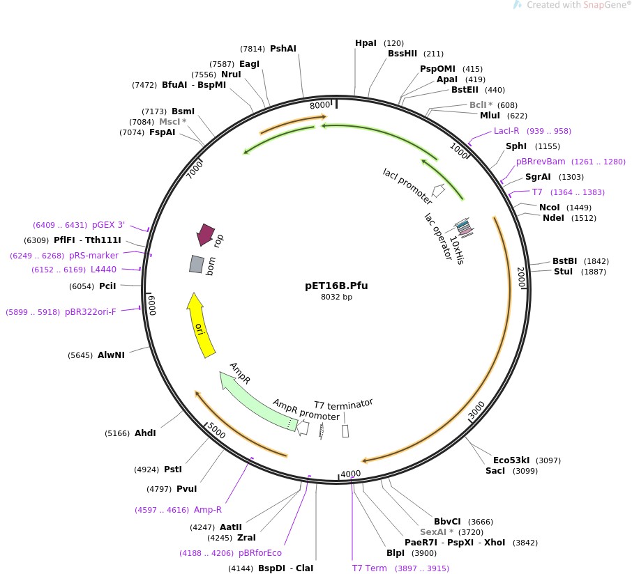 质粒名称:pET16B.Pfu 质粒编号:12509 质粒备注: Bacterial expression of Pfu DNA polymerase 载体名称:pET16b 载体大小:5711 载体类型:原核表达 原核抗性:氨苄青霉素,100μg/mL 培养温度:37℃ 克隆菌株:DH5alpha 高拷贝/低拷贝:高拷贝 插入基因:Pfu DNA polymerase 物种来源:P. furiosus 基因突变:Y218H, Q462R, F533L, K559I and V683A (mutations were not intentional, but plasmid functions as described) 插入大小:2325 克隆方法:限制性内切酶 5'克隆位点:NdeI (not destroyed) 3'克隆位点:XhoI (not destroyed) 5'测序引物:TAATACGACTCACTATAGGG 3'测序引物:GCTAGTTATTGCTCAGCGG 质粒图谱: