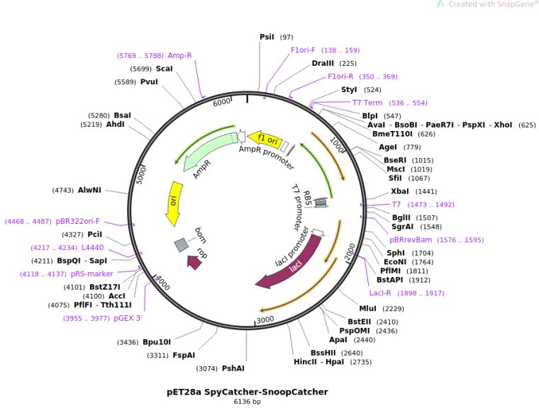 质粒名称:pET28a SpyCatcher-SnoopCatcher 质粒编号:72324 质粒备注: Bacterial expression of SpyCatcher linked to SnoopCatcher. 载体名称:pET21b 载体大小:5442 载体类型:原核表达 原核抗性:氨苄青霉素,100μg/mL 培养温度:37℃ 克隆菌株:DH5alpha 高拷贝/低拷贝:高拷贝 插入基因:pET28a SpyCatcher-SnoopCatcher 基因别名:SpyCatcher-SnoopCatcher 物种来源:Synthetic 基因突变:35 amino acids at the N-term of SpyCatcher have been deleted 插入大小:774 克隆方法:未知 5'测序引物:TAA TAC GAC TCA CTA TAG GG 质粒图谱: