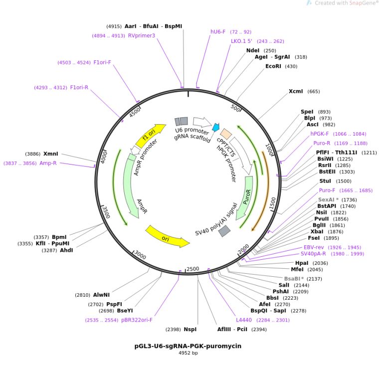 质粒名称:pGL3-U6-sgRNA-PGK-puromycin 质粒编号:51133 质粒备注: (Empty Backbone) expresses sgRNA from the U6 promoter. 载体名称:pGL3-Basic 载体类型:哺乳动物表达,CRISPR 筛选标记:嘌呤霉素 原核抗性:氨苄青霉素,100μg/mL 培养温度:37℃ 克隆菌株:DH5alpha 高拷贝/低拷贝:高拷贝 启动子:U6 克隆方法:限制性内切酶 5'测序引物:pLKO.inducible 3'测序引物:O.PGK1b-R 质粒图谱: