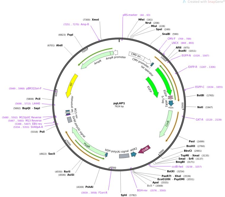 质粒名称:pgLAP1 质粒编号:19702 质粒备注: (Empty Backbone) 载体名称:pCDNA5/FRT/TO 载体大小:7624 载体类型:哺乳动物表达 筛选标记:潮霉素 原核抗性:Chloramphenicol and Ampicillin, 25 & 100 μg/mL 培养温度:37℃ 克隆菌株:ccdB Survival 高拷贝/低拷贝:高拷贝 插入基因:None 标签/融合蛋白:· EGFP (N terminal on backbone) · TEV (N terminal on backbone) · S peptide (N terminal on backbone) 克隆方法:Gateway Cloning 5'克隆位点:Gateway (not destroyed) 3'克隆位点:Gateway (not destroyed) 5'测序引物:ATC ACT CTC GGC ATG GAC GAG CTG TAC AAG 3'测序引物:TGG CTG GCA ACT AGA AGG CAC AGT CGA GGC 质粒图谱: