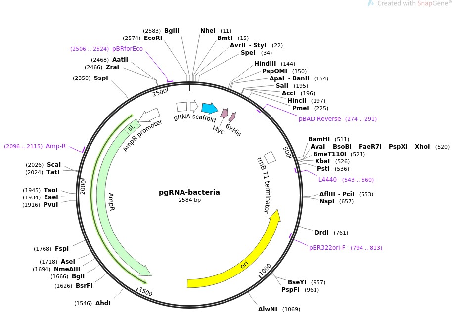 质粒名称:pgRNA-bacteria 质粒编号:44251 质粒备注: Expression of customizable guide RNA (gRNA) for bacterial gene knockdown 载体名称:pUC19 载体类型:Bacterial Expression, CRISPR 原核抗性:氨苄青霉素,100μg/mL 培养温度:37℃ 克隆菌株:Top10 高拷贝/低拷贝:高拷贝 插入基因:guide RNA (bacteria) 插入大小:102 启动子:BBa_J23119 (SpeI) 克隆方法:限制性内切酶 5'克隆位点:SpeI (not destroyed) 3'克隆位点:HindIII (not destroyed) 5'测序引物:n/a 3'测序引物:n/a 质粒图谱: