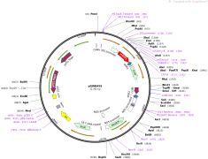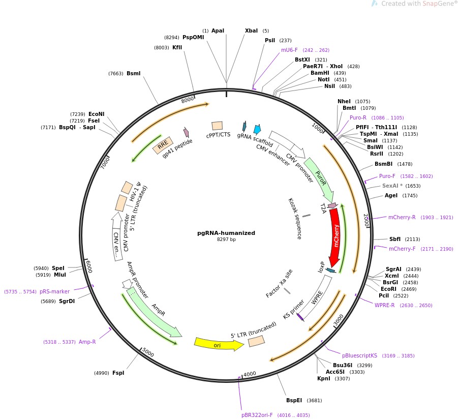质粒名称:pgRNA-humanized 质粒编号:44248 质粒备注: Expression of customizable guide RNA (gRNA) under cotnrol of murine U6 promoter, also contains a CMV-puro-t2A-mCherry expression cassette for mammalian gene knockdown 载体名称:pU6 完整质粒大小:8308 载体类型:哺乳动物表达,慢病毒,CRISPR 筛选标记:嘌呤霉素 原核抗性:氨苄青霉素,100μg/mL 培养温度:37℃ 克隆菌株:NEB Stable 高拷贝/低拷贝:高拷贝 插入基因:guide RNA 物种来源:H. sapiens (human) 插入大小:102 启动子:mouse U6 克隆方法:限制性内切酶 5'克隆位点:BstXI (not destroyed) 3'克隆位点:XhoI (not destroyed) 5'测序引物:n/a 3'测序引物:n/a 质粒图谱: