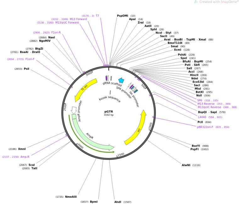 质粒名称:pGTR 质粒编号:63143 质粒备注: PCR template to construct polycistronic tRNA-gRNA 载体名称:pGEM-T Easy 载体大小:3015 完整质粒大小:3192 载体类型:CRISPR, Synthetic Biology 原核抗性:氨苄青霉素,100μg/mL 培养温度:37℃ 克隆菌株:DH5alpha 高拷贝/低拷贝:高拷贝 插入基因:gRNA-tRNA fusion 基因别名:GTR 物种来源:Synthetic 插入大小:153 质粒图谱:
