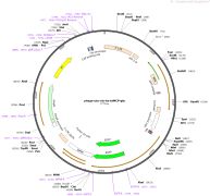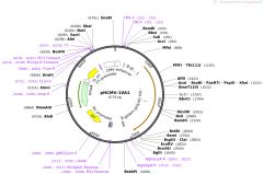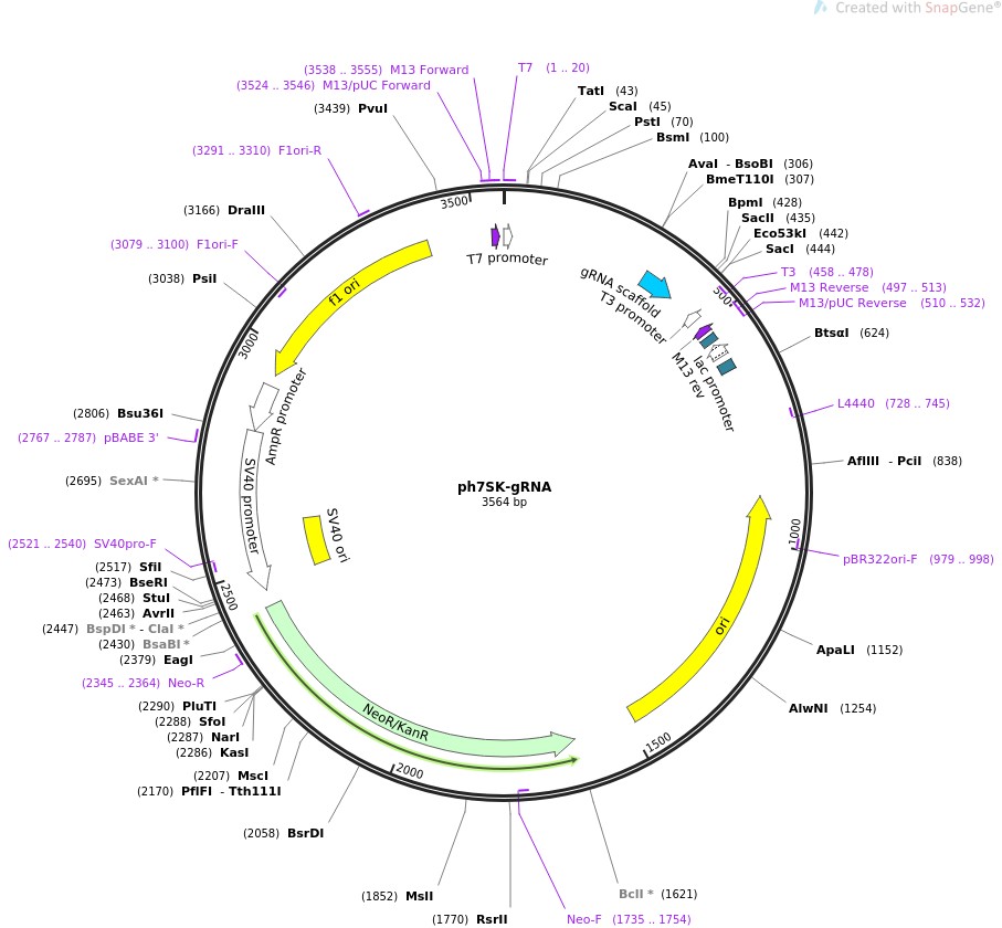 质粒名称:ph7SK-gRNA 质粒编号:53189 质粒备注: (Empty Backbone) Expresses the S. pyogenes sgRNA from the 7SK promoter 载体名称:pzDonor 载体大小:3504 载体类型:哺乳动物表达,CRISPR 原核抗性:卡那霉素,50μg/mL 培养温度:37℃ 克隆菌株:DH5alpha 高拷贝/低拷贝:未知 启动子:human 7SK 克隆方法:限制性内切酶 3'测序引物:M13 Reverse 质粒图谱: