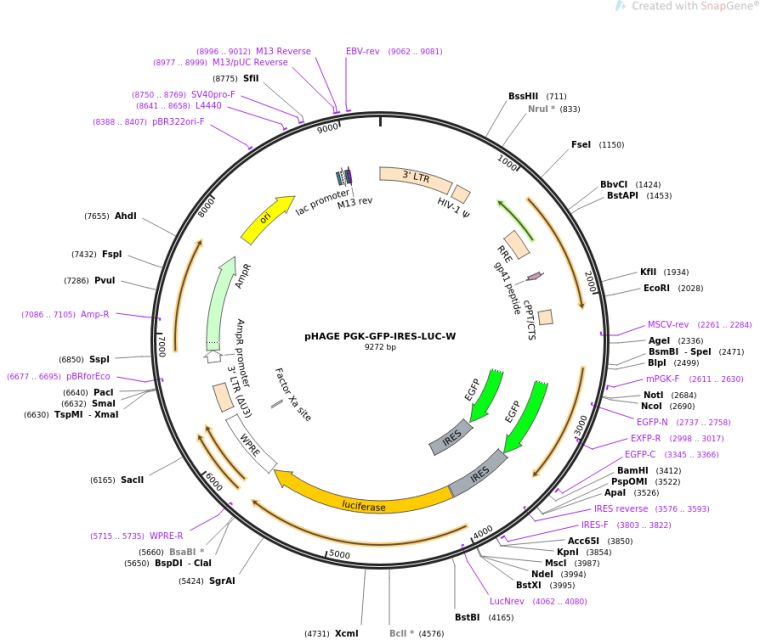 质粒名称:pHAGE PGK-GFP-IRES-LUC-W 质粒编号:46793 质粒备注: 2nd generation lentiviral vector 载体名称:pHAGE 载体大小:4874 完整质粒大小:9272 载体类型:慢病毒 原核抗性:氨苄青霉素,100μg/mL 培养温度:37℃ 克隆菌株:NEB Stable 高拷贝/低拷贝:高拷贝 插入基因:PGK 基因别名:PGK promoter 物种来源:H. sapiens (human) 插入大小:465 质粒图谱: