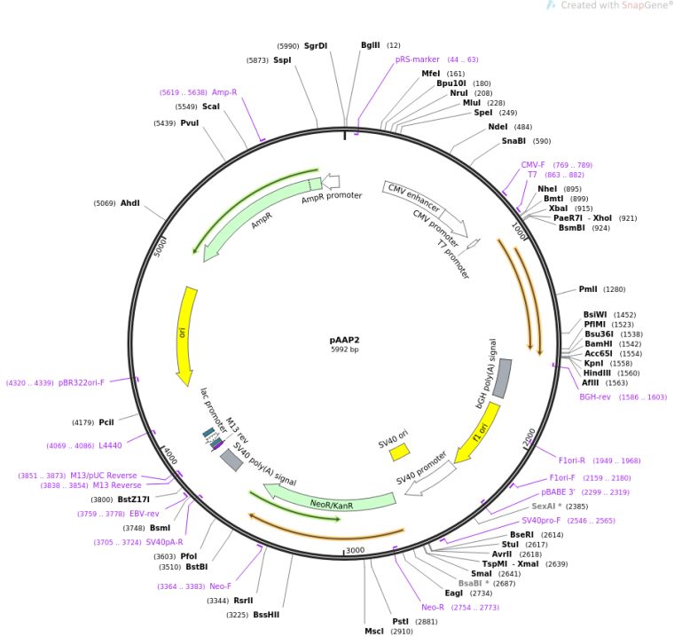 质粒名称:pAAP2 质粒编号:73211 质粒备注: express Assembly-activating protein (AAP) of adeno-associated virus serotype 2 (AAV2) 载体名称:pcDNA3 载体类型:Mammalian Expression, AAV 筛选标记:新霉素(G418) 原核抗性:氨苄青霉素,100μg/mL 培养温度:37℃ 克隆菌株:DH5alpha 高拷贝/低拷贝:未知 插入基因:AAP2 物种来源:AAV2 插入大小:612 启动子:CMV 克隆方法:未知 5'测序引物:T7 质粒图谱: