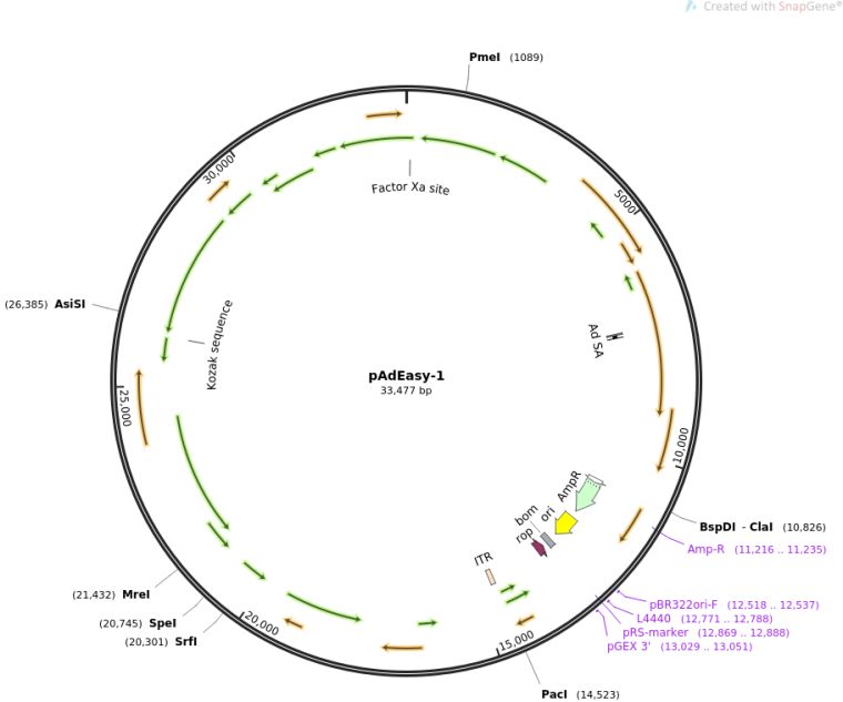 质粒名称:pAdEasy-1 质粒编号:16400 质粒备注: (Empty Backbone) Adenoviral vector for use in AdEasy System. 载体名称:pAdEasy and reg-1 载体大小:33414 载体类型:Mammalian Expression, Adenoviral 原核抗性:氨苄青霉素,100μg/mL 培养温度:37℃ 克隆菌株:NEB Stable 高拷贝/低拷贝:低拷贝 插入基因:None 克隆方法:限制性内切酶 5'测序引物:n/a 质粒图谱: