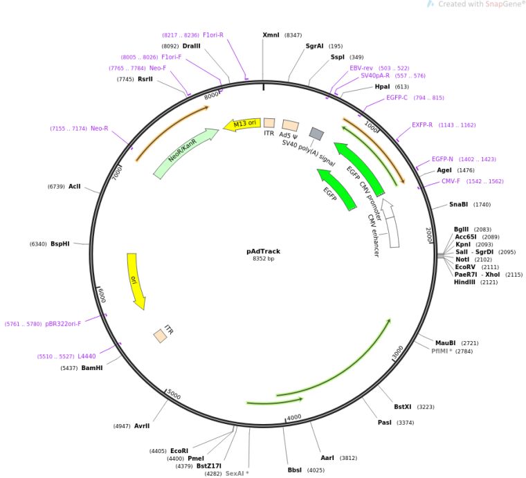 质粒名称:pAdTrack 质粒编号:16404 质粒备注: (Empty Backbone) Shuttle vector for us in AdEasy System. Used for expression of transgenes under a chosen (non-CMV) promoter when a GFP tracer is desired. 载体名称:pAdTrack 载体大小:8320 载体类型:Mammalian Expression, Adenoviral 原核抗性:卡那霉素,50μg/mL 培养温度:37℃ 克隆菌株:DH10B 高拷贝/低拷贝:低拷贝 插入基因:None 克隆方法:限制性内切酶 5'测序引物:n/a 质粒图谱: