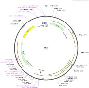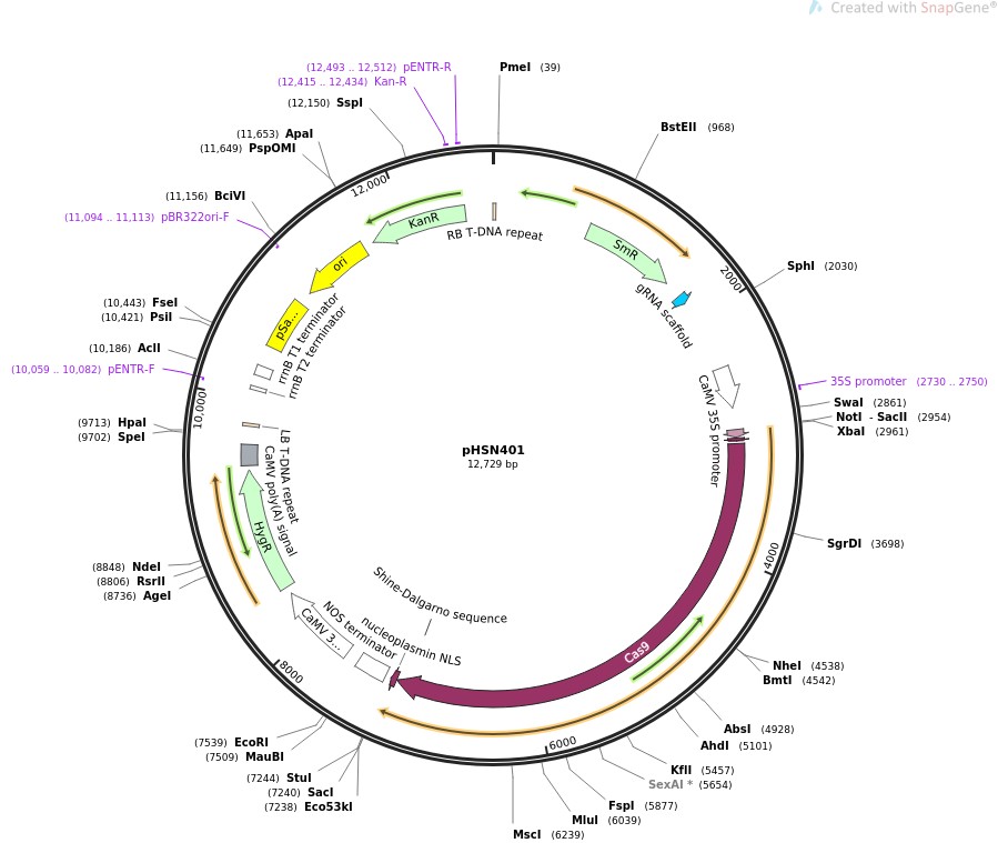 质粒名称:pHSN401 质粒编号:50588 质粒备注: CRISPR/Cas based plant genome editing and gene regulation; expresses 3×FLAG-NLS-zCas9-NLS, gRNA scaffold for insertion of target sequence (AtU6-26 promoter), Hyg resistance 载体名称:pGreen-like binary vector 载体类型:CRISPR ; Plant expression 筛选标记:潮霉素 原核抗性:Kanamycin and Spectinomycin, 50 & 50 μg/mL 培养温度:37℃ 克隆菌株:DH5alpha 高拷贝/低拷贝:高拷贝 插入基因:3×FLAG-NLS-zCas9-NLS 基因别名:Cas9 物种来源:Synthetic 基因突变:maize codon optimized 启动子:2×35Sp 标签/融合蛋白:· 3xFLAG (N terminal on insert) · NLS (N terminal on insert) 克隆方法:未知 5'测序引物:hSpCas9-R1, CGCTCGTGCTTCTTATCCTC 质粒图谱: