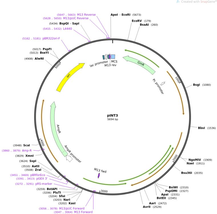 质粒名称:pINT3 质粒编号:24778 质粒备注: (Empty Backbone) 载体名称:pUC 载体大小:5694 载体类型:Integrating vector 筛选标记:Gentamicin 原核抗性:氨苄青霉素,100μg/mL 培养温度:37℃ 克隆菌株:DH5alpha 高拷贝/低拷贝:高拷贝 插入基因:None 克隆方法:限制性内切酶 5'克隆位点:HindIII (not destroyed) 3'克隆位点:HindIII (not destroyed) 5'测序引物:n/a 质粒图谱: