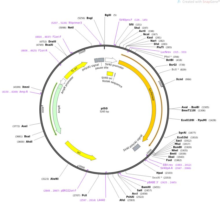 质粒名称:pIS0 质粒编号:12178 质粒备注: (Empty Backbone) 3'UTR segments of target genes can be inserted into this firefly luciferase reporter to test for their effects on protein production 载体名称:pIS0 载体大小:5264 载体类型:Mammalian Expression, Luciferase 原核抗性:氨苄青霉素,100μg/mL 培养温度:37℃ 克隆菌株:DH5alpha 高拷贝/低拷贝:高拷贝 插入基因:None 克隆方法:限制性内切酶 5'测序引物:n/a 3'测序引物:EBV rev primer (GTGGTTTGTCCAAACTCATC) 质粒图谱: