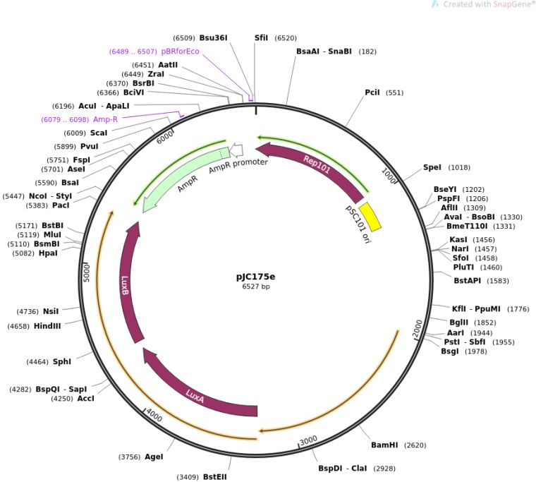 质粒名称:pJC175e 质粒编号:79219 质粒备注: Directed Evolution of Protein-Protein Interactions 载体名称:SC101 载体大小:2992 载体类型:原核表达 原核抗性:氨苄青霉素,100μg/mL 培养温度:37℃ 克隆菌株:NEB Turbo 高拷贝/低拷贝:低拷贝 插入基因:PPSP gIII, luxAB 物种来源:Synthetic 启动子:PPSP 克隆方法:Ligation Independent Cloning 5'测序引物:n/a 3'测序引物:n/a 质粒图谱: