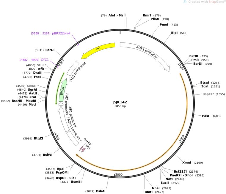 质粒名称:pJK142 质粒编号:73317 质粒备注: Encodes Crepis alpina delta-12 fatty acid acetylenase (vFAD2) as a fusion to Pas2p, with c-myc tag and His6-tag 载体名称:pPICZA 载体大小:3329 完整质粒大小:5856 载体类型:酵母表达 筛选标记:Zeocin 原核抗性:Bleocin (Zeocin), 50 μg/mL 培养温度:37℃ 克隆菌株:DH5alpha 高拷贝/低拷贝:未知 插入基因:delta-12 fatty acid acetylenase 基因别名:vFAD2 物种来源:Crepis alpina 基因突变:synthetic gene. Encodes a glycine-204 to serine mutation in the Pas2 fusion domain 启动子:AOX1 标签/融合蛋白:· c-myc (C terminal on backbone) · His6 (C terminal on backbone) · Pas2p (N terminal on insert) 克隆方法:限制性内切酶 5'克隆位点:PmlI (not destroyed) 3'克隆位点:ApaI (not destroyed) 5'测序引物:5'-AOX1 primer 3'测序引物:3'-AOX primer 质粒图谱: