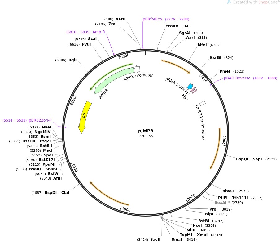 质粒名称:pJMP3 质粒编号:79875 质粒备注: Bacillus subtilis sgRNA expression vector; integrates into thrC 载体名称:pDG1731 载体大小:6673 完整质粒大小:7263 载体类型:Bacterial Expression, CRISPR 筛选标记:Bacillus subtilis spectinomycin marker 原核抗性:氨苄青霉素,100μg/mL 培养温度:37℃ 克隆菌株:DH5alpha 高拷贝/低拷贝:高拷贝 插入基因:sgRNA RR1 基因别名:sgRNA NT 基因别名:anti-RFP sgRNA 物种来源:Streptococcus pyogenes 启动子:veg 克隆方法:限制性内切酶 5'克隆位点:EcoRI (not destroyed) 3'克隆位点:EcoRI (not destroyed) 5'测序引物:tgtccgttccatctgtgaga 质粒图谱: