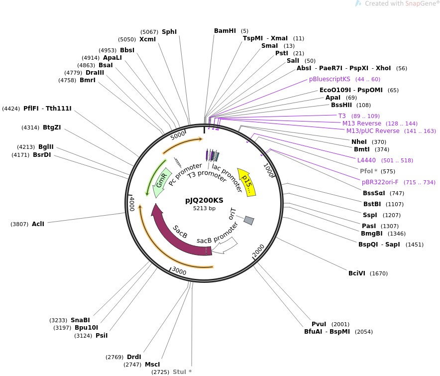 质粒名称:pJQ200KS 质粒编号:78498 质粒备注: (Empty Backbone) Suicide vector 载体名称:pJQ200 载体大小:4922 载体类型:Suicide plasmid 筛选标记:Gentamicin 原核抗性:Gentamicin, 10 μg/mL 培养温度:37℃ 克隆菌株:DH5alpha 高拷贝/低拷贝:高拷贝 克隆方法:限制性内切酶 5'测序引物:T7 3'测序引物:T3 质粒图谱:
