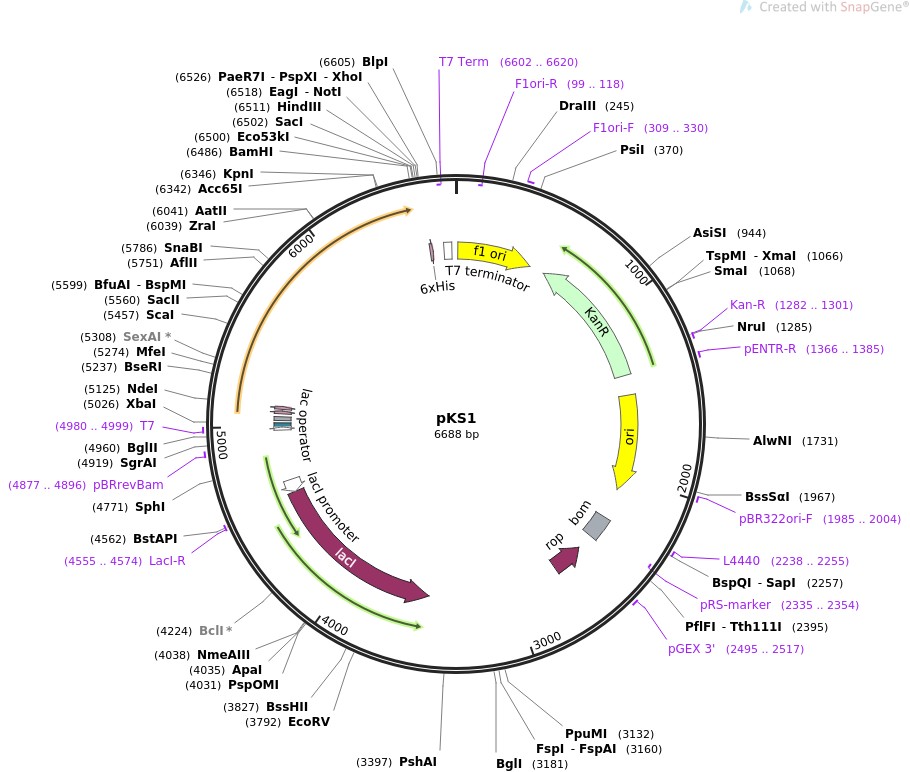 质粒名称:pKS1 质粒编号:84079 质粒备注: Expresses the non-toxic fragment C of tetanus toxin 载体名称:pET28a 载体大小:5300 完整质粒大小:6692 载体类型:原核表达 原核抗性:卡那霉素,50μg/mL 培养温度:37℃ 克隆菌株:DH5alpha 高拷贝/低拷贝:高拷贝 插入基因:Tetanus neurotoxin fragment C 基因别名:Tetanus fragment C 物种来源:Synthetic; Clostridium tetani 启动子:T7 克隆方法:限制性内切酶 5'克隆位点:NdeI (not destroyed) 3'克隆位点:BamHi (not destroyed) 5'测序引物:unknown 3'测序引物:unknown 质粒图谱: