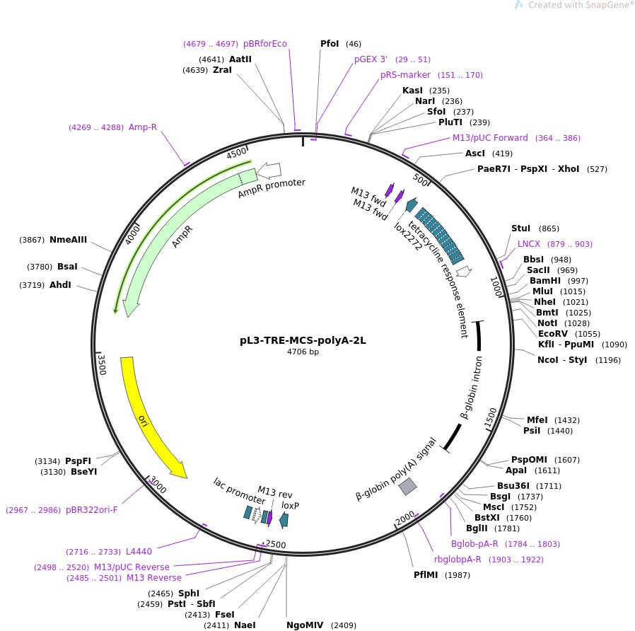 质粒名称:pL3-TRE-MCS-polyA-2L 质粒编号:11719 质粒备注: (Empty Backbone) 载体名称:None 载体大小:4706 载体类型:Mammalian Expression, Cre/Lox 原核抗性:氨苄青霉素,100μg/mL 培养温度:37℃ 克隆菌株:DH5alpha 高拷贝/低拷贝:高拷贝 插入基因:None 克隆方法:限制性内切酶 5'测序引物:See map 质粒图谱: