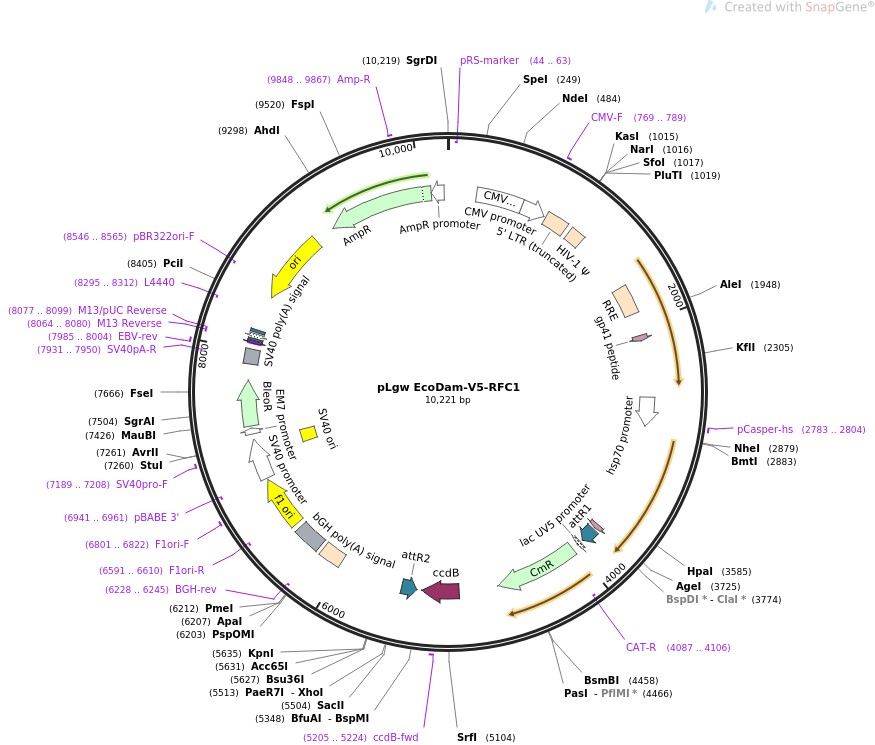质粒名称:pLgw EcoDam-V5-RFC1 质粒编号:59209 质粒备注: (Empty Backbone) Mammalian DamID lentiviral vector for fusing gene of interest with Dam-V5 using Gateway cloning 载体名称:HIV-CS-CG 载体类型:Mammalian Expression, Lentiviral ; DamID 筛选标记:Zeo marker is outside the LTRs and will not be packaged into virus. 原核抗性:Chloramphenicol and Ampicillin, 25 & 100 μg/mL 培养温度:37℃ 克隆菌株:ccdB Survival 高拷贝/低拷贝:未知 启动子:Heat Shock Minimal Promoter 标签/融合蛋白:· Dam (N terminal on backbone) · V5 (N terminal on backbone) 克隆方法:Gateway Cloning 5'测序引物:pCasper-hs (GCAACTACTGAAATCTGCCAAG) 质粒图谱: