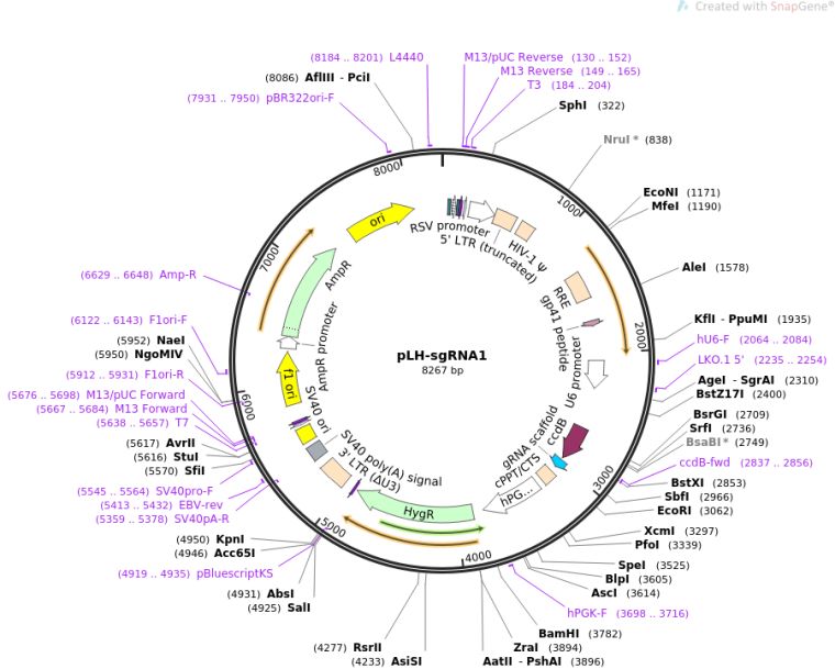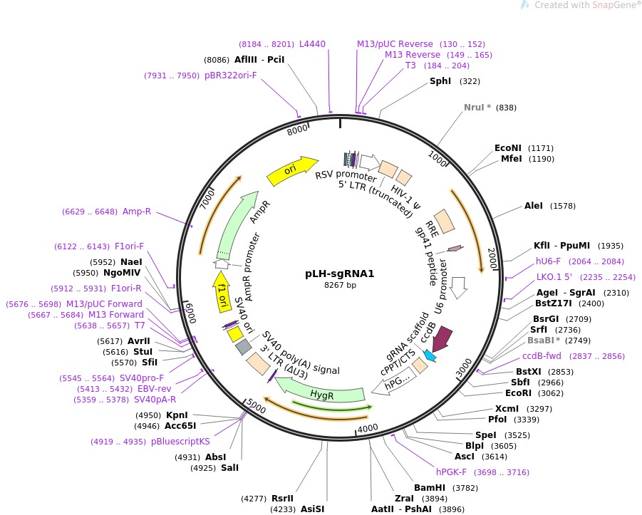 质粒名称:pLH-sgRNA1 质粒编号:75388 质粒备注: sgRNA1 载体名称:pLKO.1 载体大小:8000 完整质粒大小:8267 载体类型:哺乳动物表达,慢病毒,CRISPR 筛选标记:潮霉素 原核抗性:氨苄青霉素,100μg/mL 培养温度:37℃ 克隆菌株:ccdB Survival 高拷贝/低拷贝:高拷贝 插入基因:sgRNA1 物种来源:Synthetic 插入大小:76 启动子:U6 克隆方法:限制性内切酶 5'克隆位点:Sbf I (not destroyed) 3'克隆位点:EcoR I (not destroyed) 5'测序引物:cccttcaccgagggcctatttccc 3'测序引物:CTATTCTTTCCCCTGCACTGTACCC 质粒图谱: