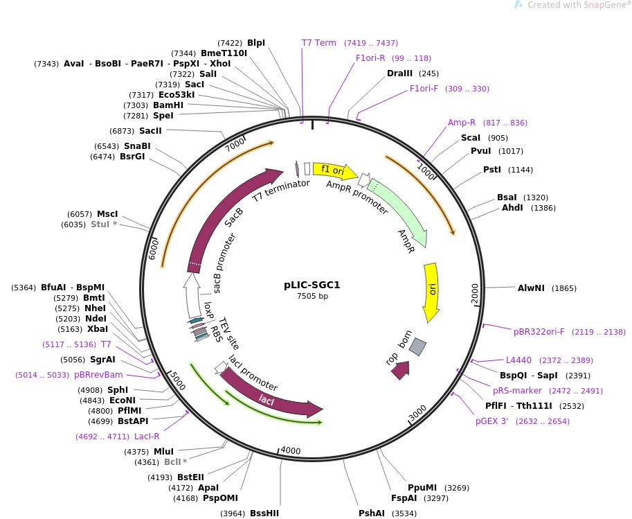 质粒名称:pLIC-SGC1 质粒编号:39187 质粒备注: (Empty Backbone) SGC Empty backbone for bacterial expression 载体名称:pLIC-SGC1 载体类型:原核表达 原核抗性:氨苄青霉素,100μg/mL 培养温度:37℃ 克隆菌株:Mach1 高拷贝/低拷贝:低拷贝 插入基因:none 克隆方法:Ligation Independent Cloning 5'测序引物:T7 3'测序引物:T7-term 质粒图谱: