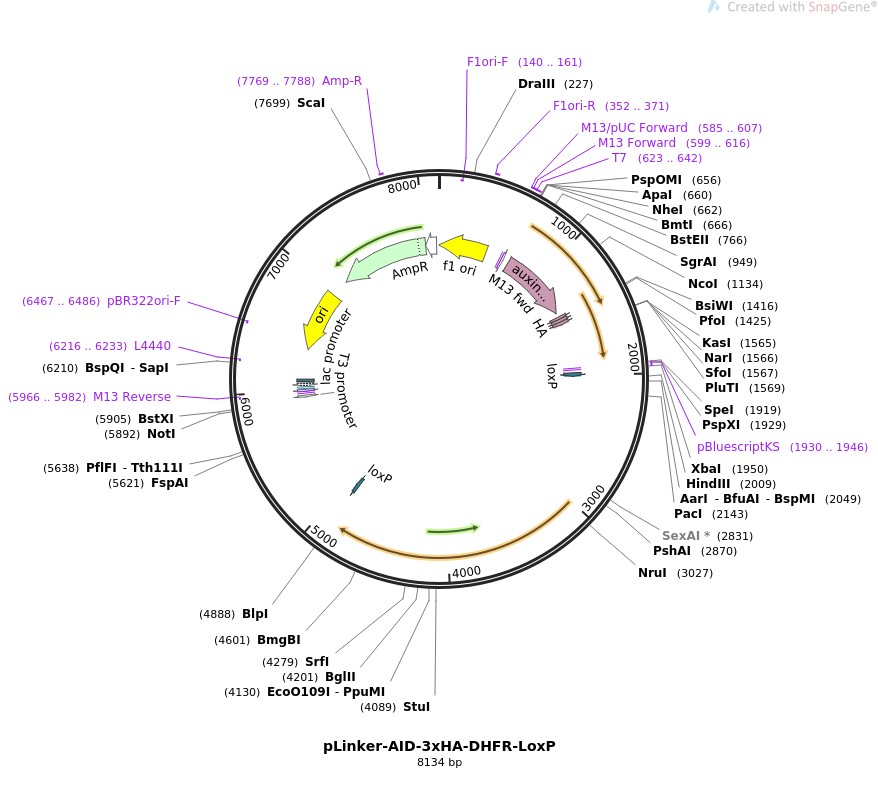 质粒名称:pLinker-AID-3xHA-DHFR-LoxP 质粒编号:86669 质粒备注: for generation of AID strains using CRISPR tagging technology 载体名称:pUC19 载体类型:Expression in Toxoplasma gondii 原核抗性:氨苄青霉素,100μg/mL 培养温度:37℃ 克隆菌株:DH5alpha 高拷贝/低拷贝:高拷贝 插入基因:Linker-AID-3xHA-HXGPRT 3'UTR 物种来源:Toxoplasma gondii 插入大小:1263 克隆方法:限制性内切酶 5'克隆位点:NheI (not destroyed) 3'克隆位点:PxpXI (not destroyed) 5'测序引物:GGGCCCgctagcAAGGGCTCGGGCTCGACCCAGCTGATGGGCAGTGTCGAGCT 3'测序引物:GACCCTCGAGTAGAACTAGTGGATCCGAGC 质粒图谱: